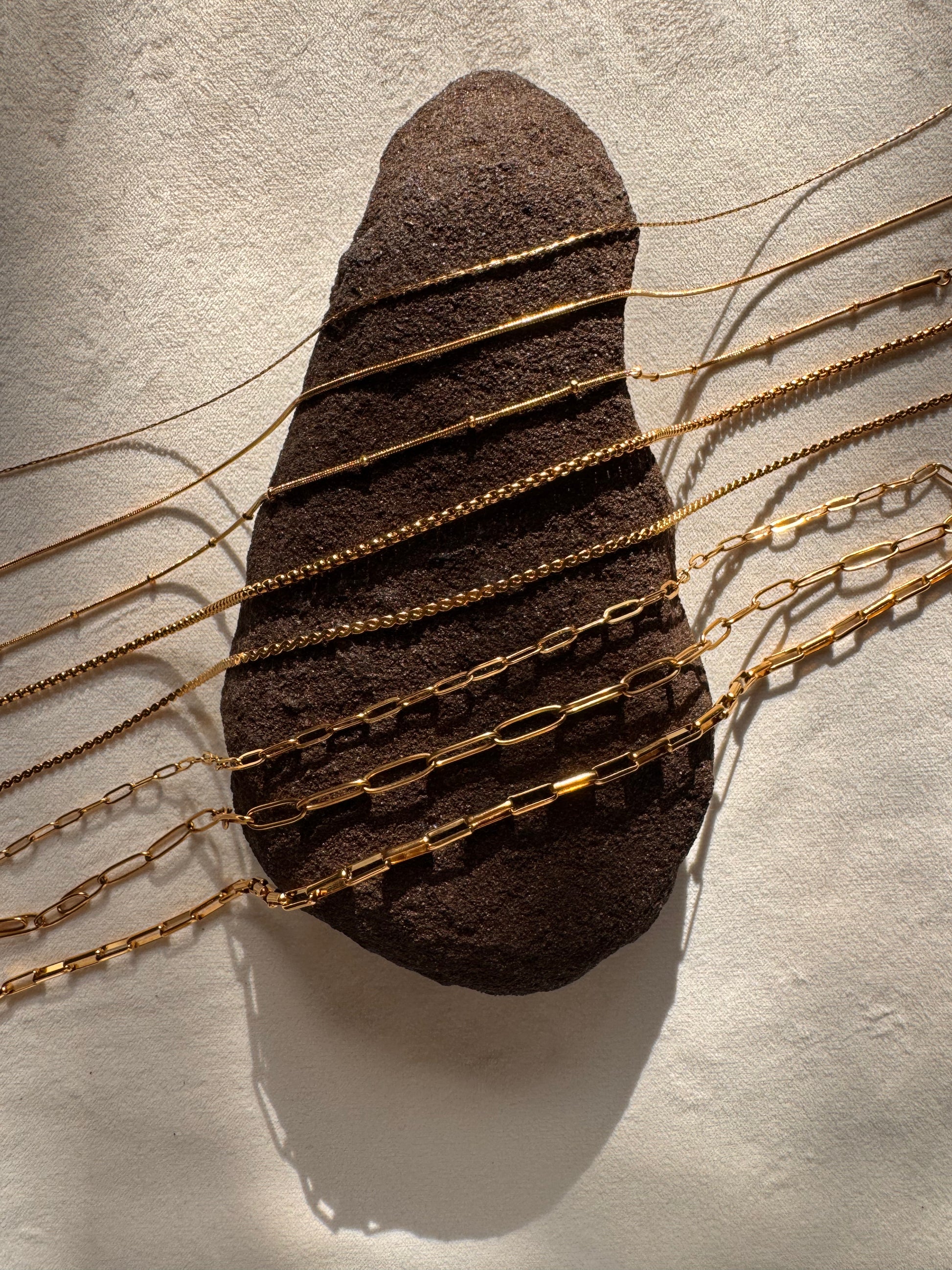 A unique wave-style chain with a softly textured finish, between matte and shine, giving it an exotic and understated elegance. Its versatile look makes it perfect for layering or wearing alone. If no request is made, the chain will be shipped at the standard 45cm length.